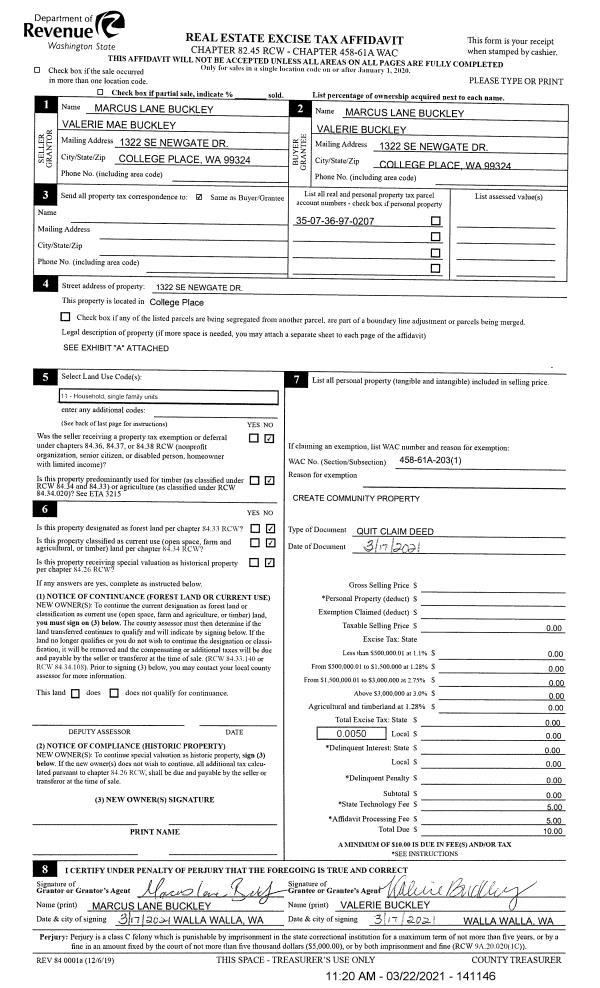 | 2 | 03/17/2021 | QCD | QUIT CLAIM DEED | BUCKLEY MARCUS LANE | BUCKLEY MARCUS LANE & VALERIE | | | $0.00 | 141146 | 2021-03227 |