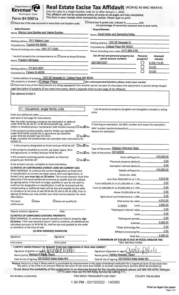 | 1 | 02/15/2022 | SWD | STATUTORY WARRANTY DEED | BUCKLEY MARCUS LANE & VALERIE | KELLEY DAVID & SAMANTHA | | | $410,000.00 | 143393 | 2022-01382 |