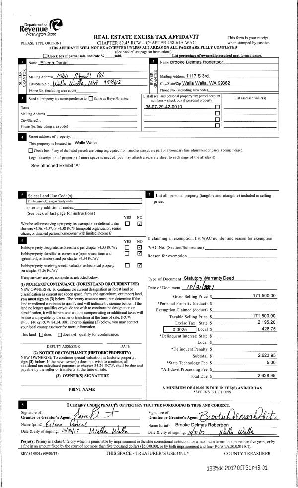 | 4 | 10/31/2017 | SWD | STATUTORY WARRANTY DEED | DANIEL EILEEN L | ROBERTSON BROOKE DELMAS | | | $171,500.00 | 133544 | 2017-08777 |