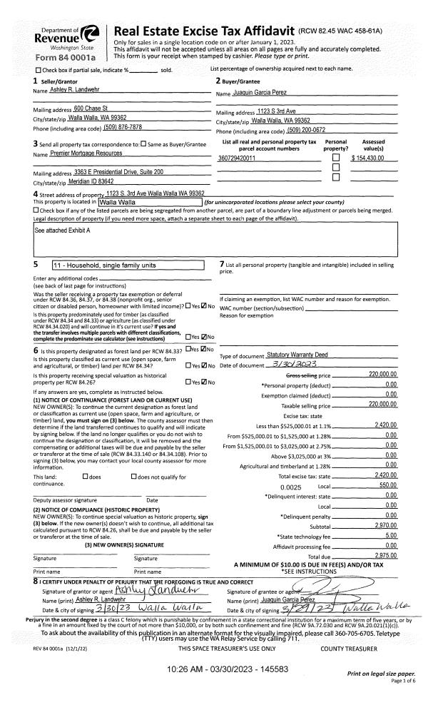 | 1 | 03/30/2023 | SWD | STATUTORY WARRANTY DEED | LANDWEHR ASHLEY R | PEREZ JUAQUIN GARCIA | | | $220,000.00 | 145583 | 2023-01604 |