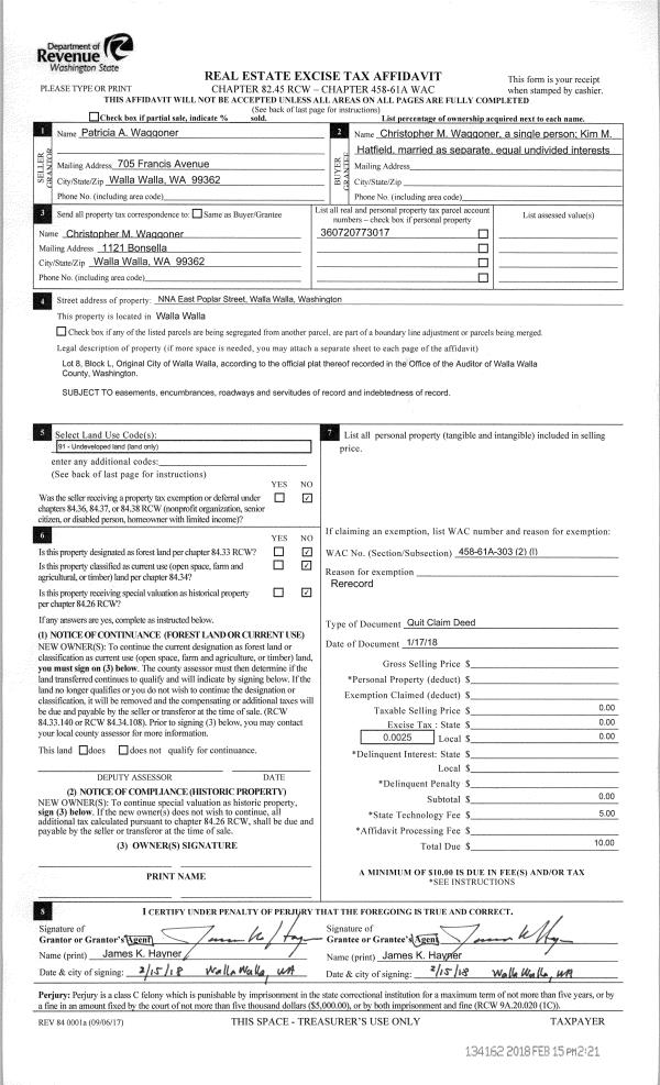 | 2 | 01/17/2018 | QCD | QUIT CLAIM DEED | WAGGONER PATRICIA A ESTATE OF | WAGGONER CHRISTOPHER M | | | $0.00 | 134162 | 2018-00519 |