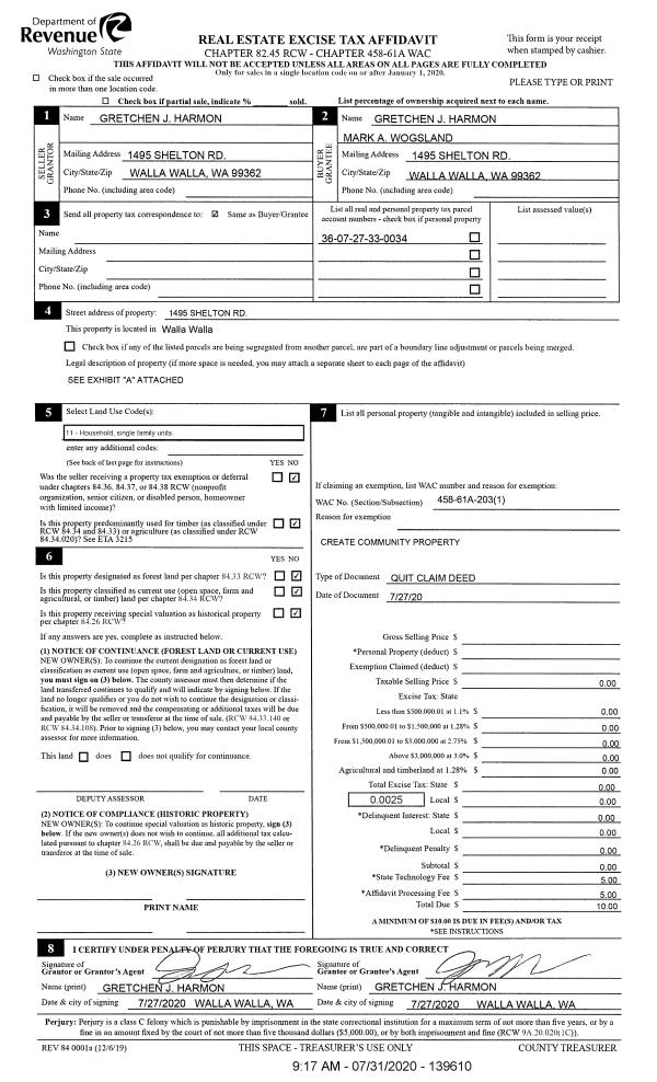 | 3 | 07/31/2020 | QCD | QUIT CLAIM DEED | HARMON GRETCHEN J | HARMON GRETCHEN J & MARK A WOGSLAND | | | | 139610 | 2020-07413 |