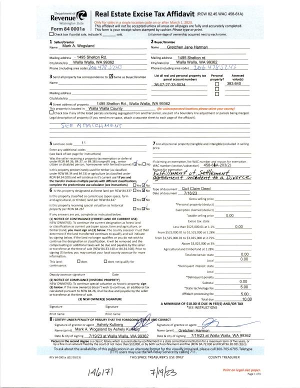 | 2 | 07/19/2023 | QCD | QUIT CLAIM DEED | HARMON GRETCHEN J & MARK A WOGSLAND | HARMON GRETCHEN JANE | | | $0.00 | 146171 | 2023-04076 |