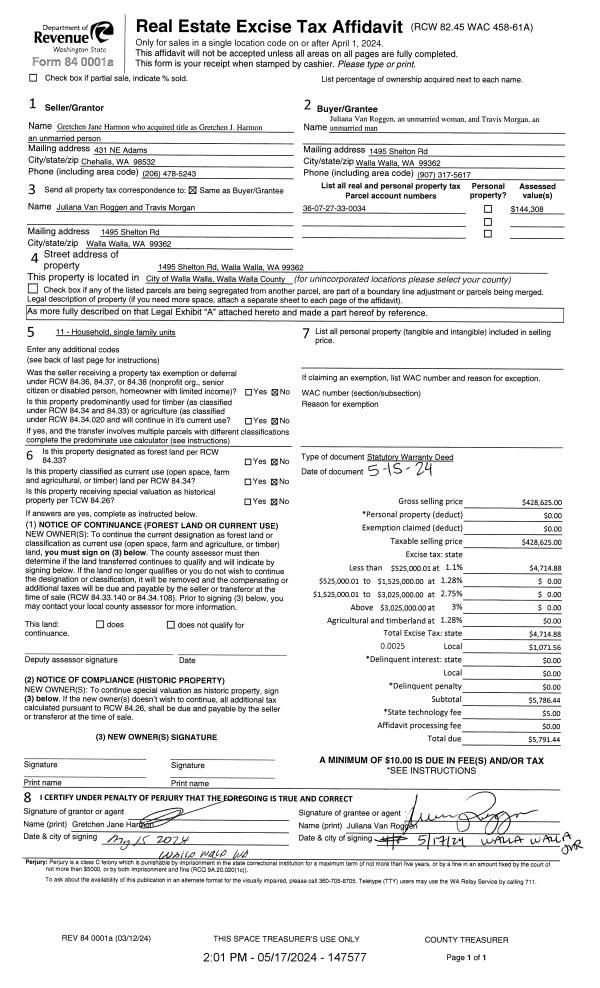 | 1 | 05/17/2024 | SWD | STATUTORY WARRANTY DEED | HARMON GRETCHEN JANE | VAN ROGGEN JULIANA | | | $428,625.00 | 147577 | 2024-02645 |