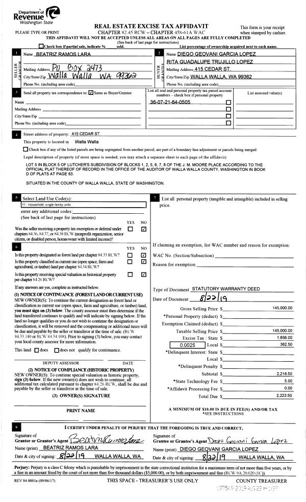 | Mailing Address: | RITA GUADALUPE TRUJILLO LOPEZ 415 CEDAR ST WALLA WALLA, WA 99362 | % Ownership: | 100.0000000000% |