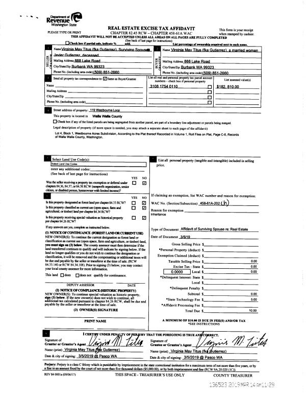 | 5 | 03/05/2019 | AFFIDAVIT | AFFIDAVIT | GUTIERREZ JAVIER & VIRGINIA M | TITUS VIRGINIA MAY | | | $0.00 | 136523 | 2019-01654 |