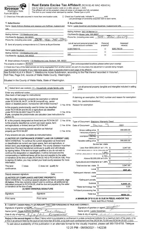 | 3 | 08/09/2021 | SWD | STATUTORY WARRANTY DEED | BODWAY DEREK ANTHONY | GOODMAN LESLIE & ANDREA | | | $358,900.00 | 142238 | 2021-09657 |
