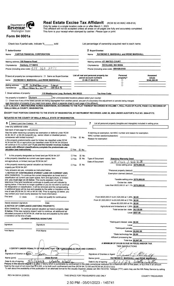 | 1 | 05/01/2023 | SWD | STATUTORY WARRANTY DEED | CARTUS FINANCIAL CORPORATION | MARSHALL RAYMOND E & IRENE S | | | $375,000.00 | 145741 | 2023-02286 |