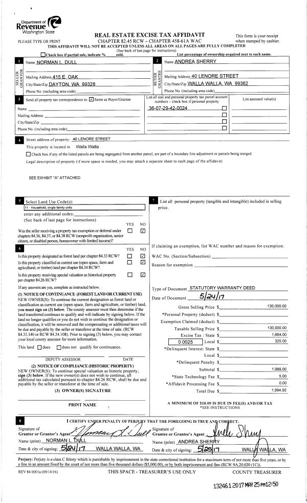 | 3 | 05/25/2017 | SWD | STATUTORY WARRANTY DEED | DULL NORMAN L | SHERRY ANDREA | | | $130,000.00 | 132461 | 2017-03970 |