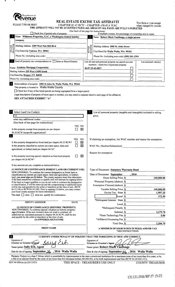 | 1 | 09/27/2016 | SWD | STATUTORY WARRANTY DEED | WILKINSON PROPERTIES LLC | VAN DONGE ROBERT MARK | | | $149,000.00 | 131131 | 2016-07940 |