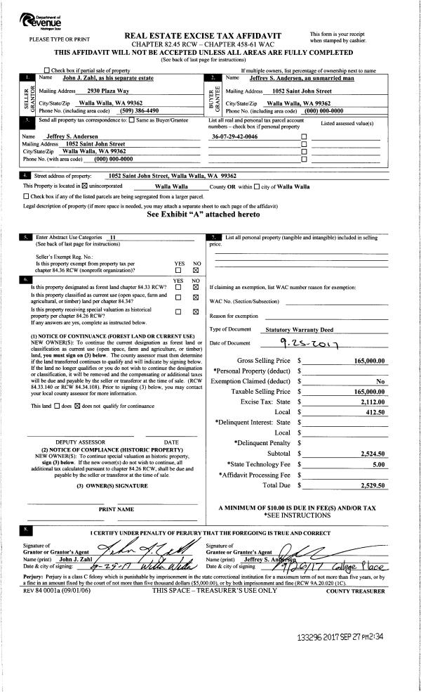 | 2 | 09/27/2017 | SWD | STATUTORY WARRANTY DEED | ZAHL JOHN J | ANDERSEN JEFFREY S | | | $165,000.00 | 133296 | 2017-07635 |