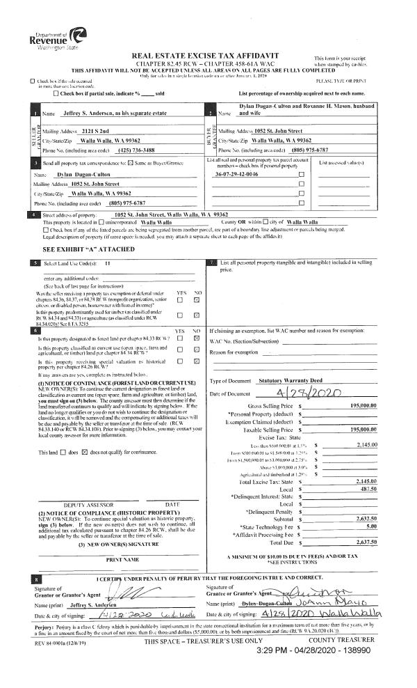 | 1 | 04/28/2020 | SWD | STATUTORY WARRANTY DEED | ANDERSEN JEFFREY S | DUGAN-CULTON DYLAN & ROXANNE H MASON | | | $195,000.00 | 138990 | 2020-03637 |