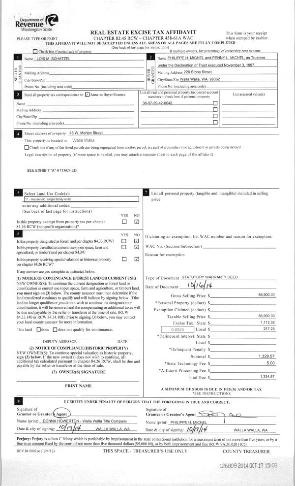 | 2 | 10/17/2014 | SWD | STATUTORY WARRANTY DEED | SCHATZEL LOIS | MICHEL PHILIPPE H & PENNY L | | | $86,900.00 | 126809 | 2014-07615 |