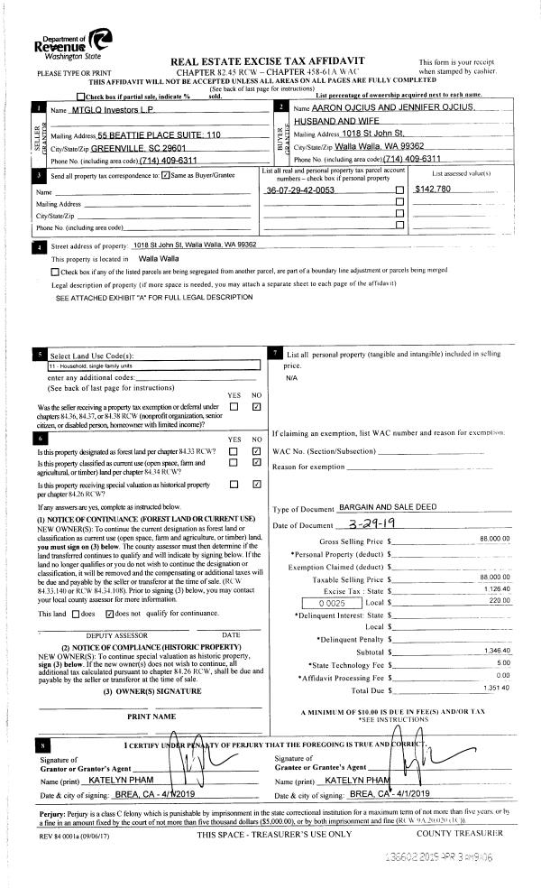 | 4 | 04/03/2019 | BARGAIN & | BARGAIN & SALE DEED | MTGLQ INVESTORS LP | OJCIUS AARON & JENNIFER | | | $88,000.00 | 136602 | 2019-02074 |