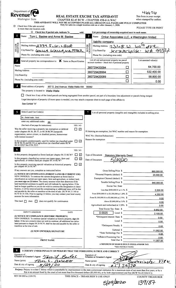 | 1 | 05/29/2020 | SWD | STATUTORY WARRANTY DEED | BASLEE TOM L | ONKAR ASSOCIATES LLC | | 3-PARCELS | $840,000.00 | 139187 | 2020-04773 |