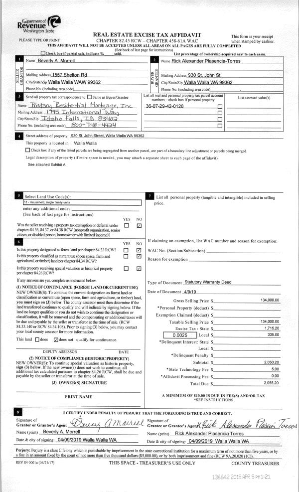 | 3 | 04/09/2019 | SWD | STATUTORY WARRANTY DEED | MORRELL KEITH R ESTATE OF | PLASENCIA-TORRES RICK ALEXANDER | | | $134,000.00 | 136642 | 2019-02221 |