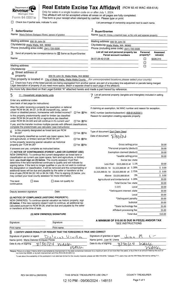 | 1 | 09/06/2024 | QCD | QUIT CLAIM DEED | FLORES MARIA DELORES ENRIQUEZ | URENA JUAN M | | | | 148151 | 2024-05064 |