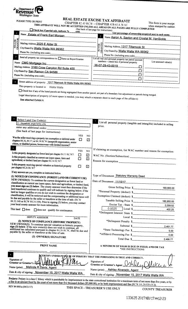| 1 | 11/17/2017 | SWD | STATUTORY WARRANTY DEED | MORGAN FRANK E ESTATE OF | SAXTON AARON A | | | $160,900.00 | 133635 | 2017-09279 |