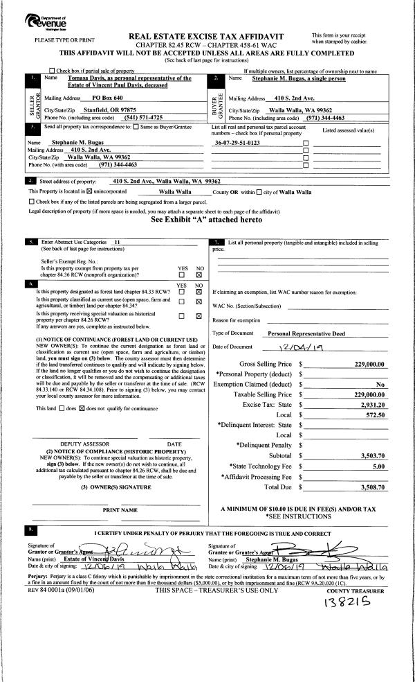 | 2 | 12/06/2019 | DPR | DEED OF PERSONAL REPRESENTATIVE | DAVIS VINCENT PAUL ESTATE OF | BUGAS STEPHANIE M | | | $229,000.00 | 138215 | 2019-10149 |