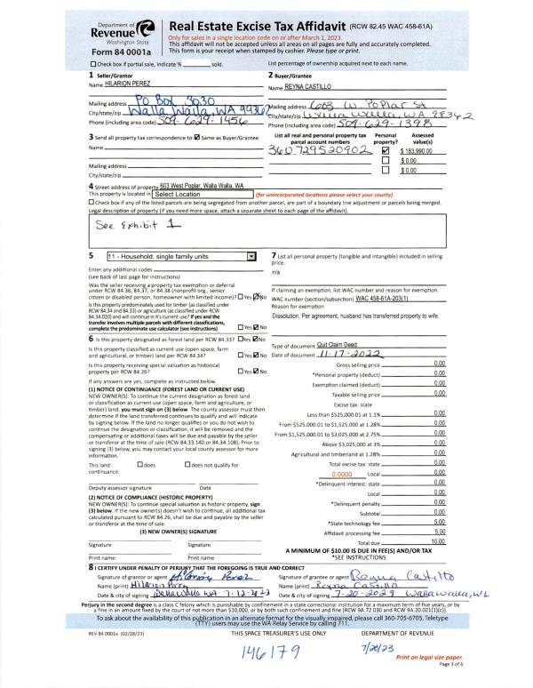 | 1 | 07/20/2023 | QCD | QUIT CLAIM DEED | PEREZ HILARION | CASTILLO REYNA | | | $0.00 | 146179 | 2023-04099 |