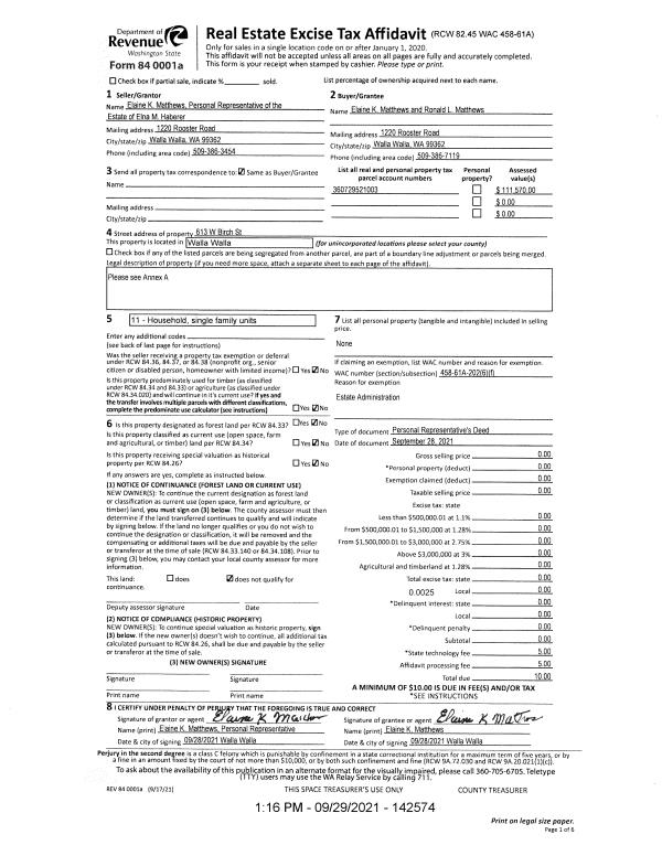 | 3 | 09/29/2021 | DPR | DEED OF PERSONAL REPRESENTATIVE | HABERER ELNA M ESTATE OF | MATTHEWS RONALD L & ELAINE K | | | $0.00 | 142574 | 2021-11916 |