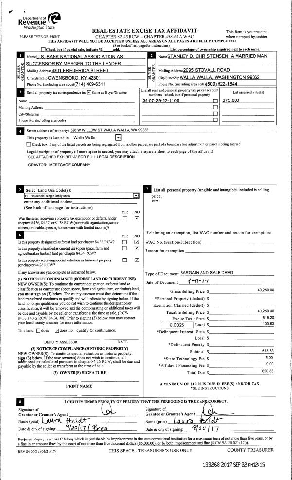 | 3 | 09/22/2017 | BARGAIN & | BARGAIN & SALE DEED | US BANK NA | CHRISTENSEN STANLEY D | | | $40,250.00 | 133268 | 2017-07486 |