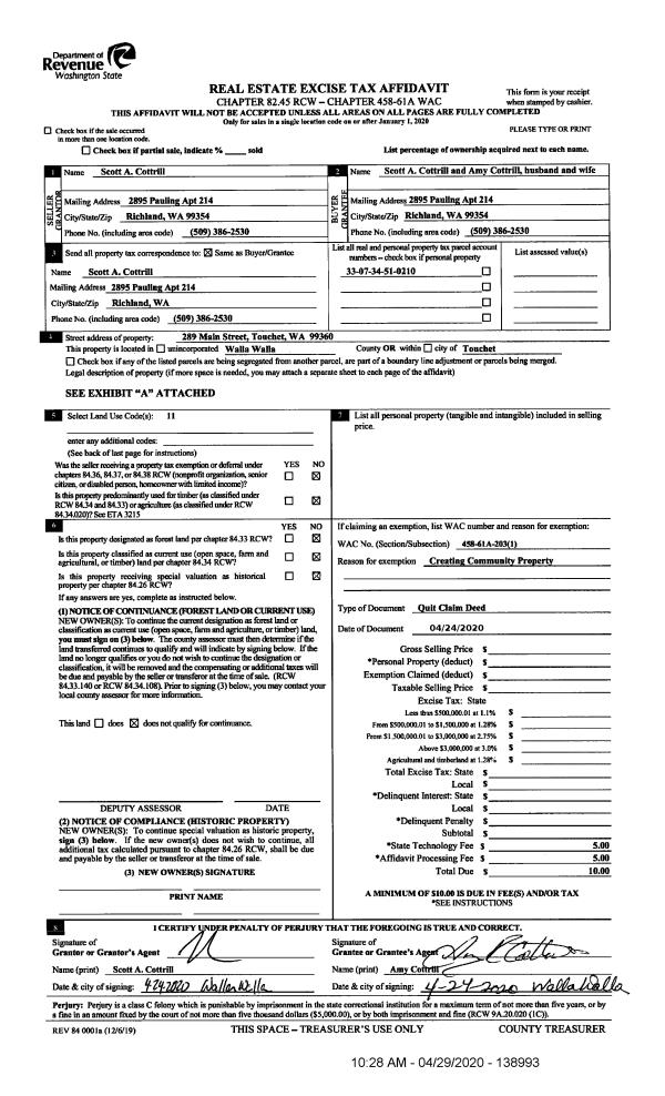 | 2 | 04/24/2020 | QCD | QUIT CLAIM DEED | COTTRILL SCOTT A | COTTRILL SCOTT A & AMY | | | $0.00 | 138993 | 2020-03651 |