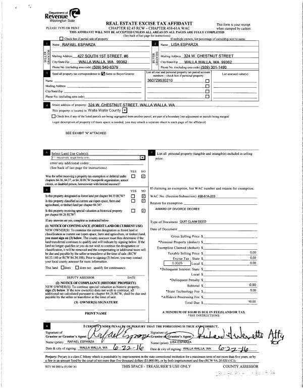 | 1 | 06/22/2016 | QCD | QUIT CLAIM DEED | ESPARZA RAFAEL & LISA D | ESPARZA LISA | | | $0.00 | 130494 | 2016-04861 |