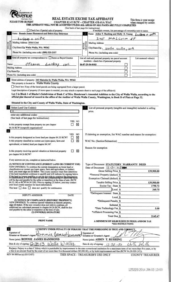 | 3 | 01/03/2014 | WARRANTY D | WARRANTY DEED | HAMMOND RONNIE JAMES | RUSHING AIDEN T | | | $139,900.00 | 125228 | 2014-00052 |