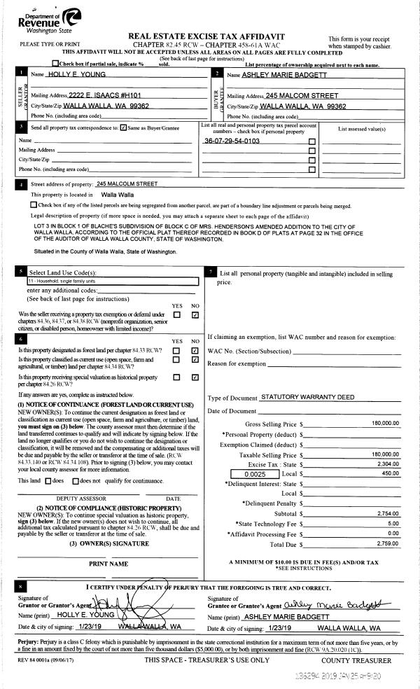 | 1 | 01/25/2019 | SWD | STATUTORY WARRANTY DEED | YOUNG HOLLY | BADGETT ASHLEY MARIE | | | $180,000.00 | 136294 | 2018-00493 |