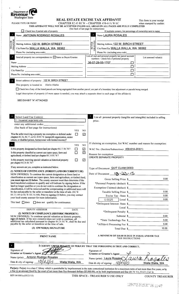 | 1 | 10/23/2015 | QCD | QUIT CLAIM DEED | ROSALES ANTONIN RODRIGO & LAURA | ROSALES LAURA | | | | 129072 | 2015-09343 |
