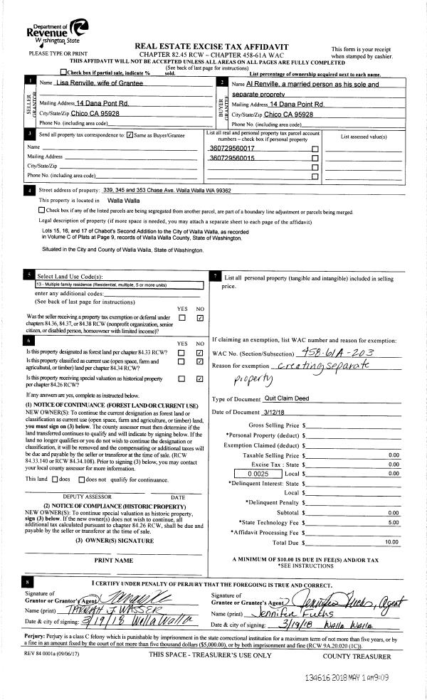 | 2 | 05/01/2018 | QCD | QUIT CLAIM DEED | RENVILLE LISA | RENVILLE ALLEN | | 2-PARCLES | | 134616 | 2018-03415 |