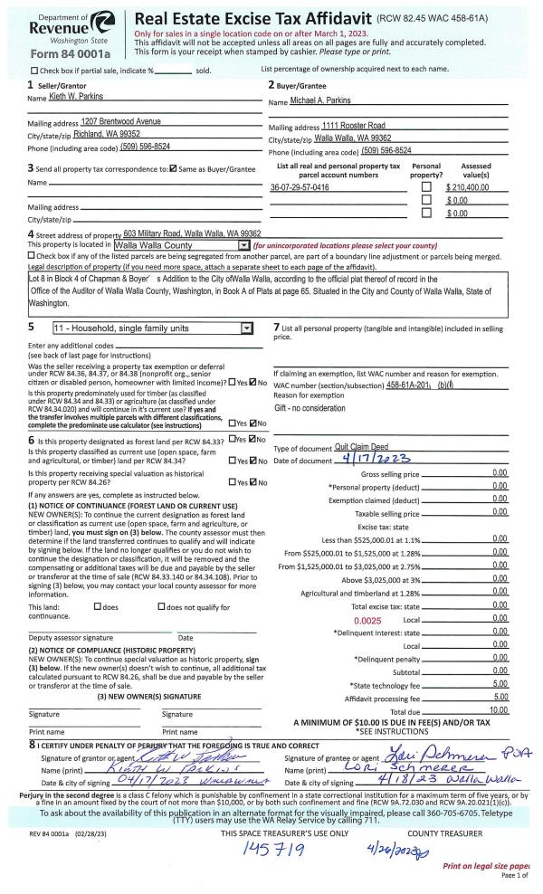 | 2 | 04/26/2023 | QCD | QUIT CLAIM DEED | PARKINS KIETH | PARKINS MICHAEL A ESTATE OF | | | $0.00 | 145719 | 2023-02197 |