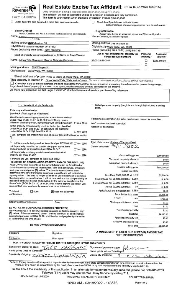 | Mailing Address: | MINERVA ALEJANDRA CARDENAS 353 W MAPLE ST WALLA WALLA, WA 99362 | % Ownership: | 100.0000000000% |