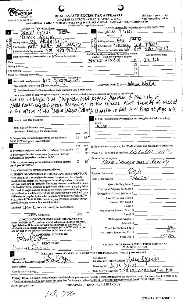 | 4 | 07/22/2010 | QCD | QUIT CLAIM DEED | OJCIUS, DANIEL & TERESA ANN | OJCIUS, JULIA E | | | | 118776 | 2010-05643 |