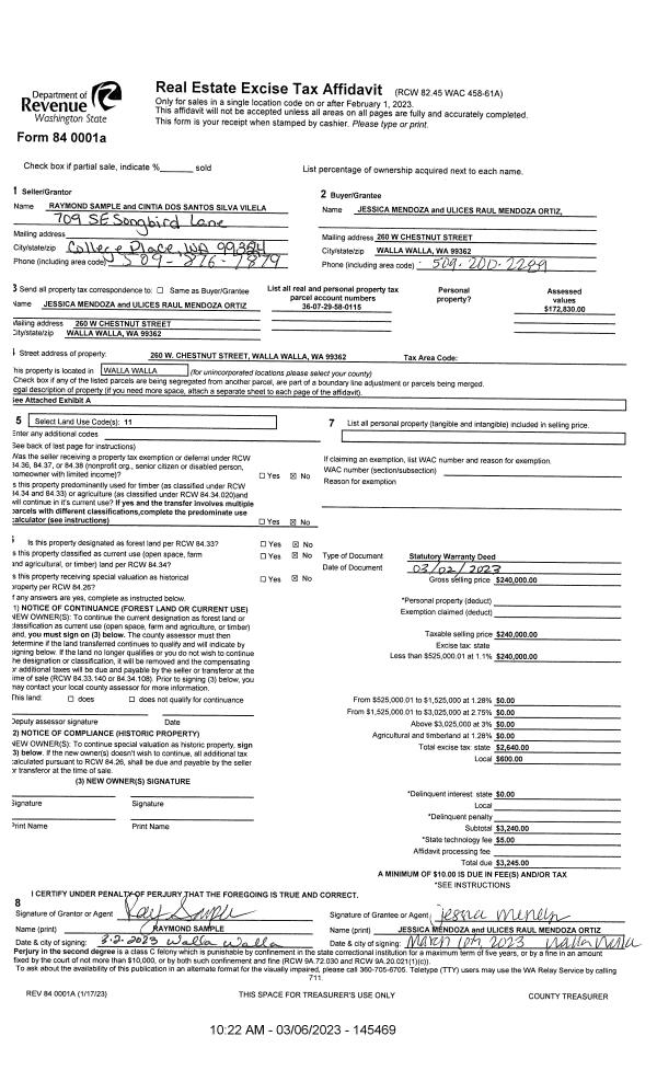 | 1 | 03/06/2023 | SWD | STATUTORY WARRANTY DEED | SAMPLE RAYMOND | MENDOZA JESSICA & ULICES RAUL MENDOZA ORTIZ | | | $240,000.00 | 145469 | 2023-01127 |