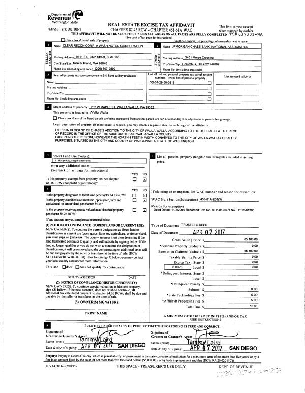 | 3 | 04/14/2017 | TRUSTEES D | TRUSTEE'S DEED | SANDEFUR CAROL | JP MORGAN CHASE BANK NATIONAL ASSOCIATION | | | $65,100.00 | 132204 | 2017-02806 |