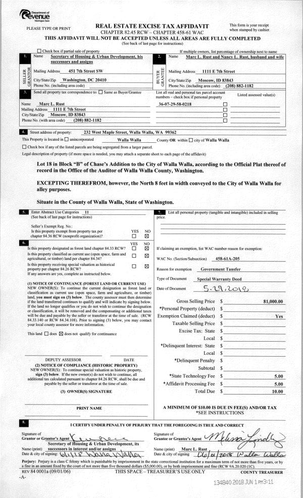 | 1 | 06/01/2018 | SWP | Special Warranty Deed | SECRETARY OF HOUSING AND URBAN DEVELOPMENT | RUST MARC L & NANCY L | | | $81,000.00 | 134840 | 2018-04353 |