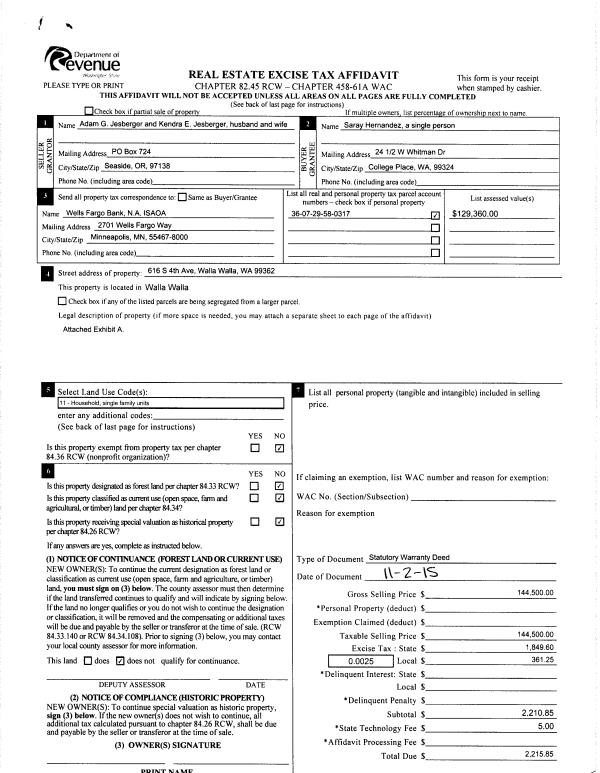 | 1 | 11/04/2015 | SWD | STATUTORY WARRANTY DEED | JESBERGER ADAM G | HERNANDEZ SARAY | | | $144,500.00 | 129129 | 2015-09608 |