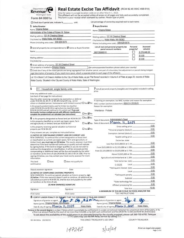 | 1 | 03/12/2024 | ADMD | ADMINISTRATOR'S DEED | BYBEE RUBEN | BYBEE VIRGENA | | | | 147242 | 2024-01209 |