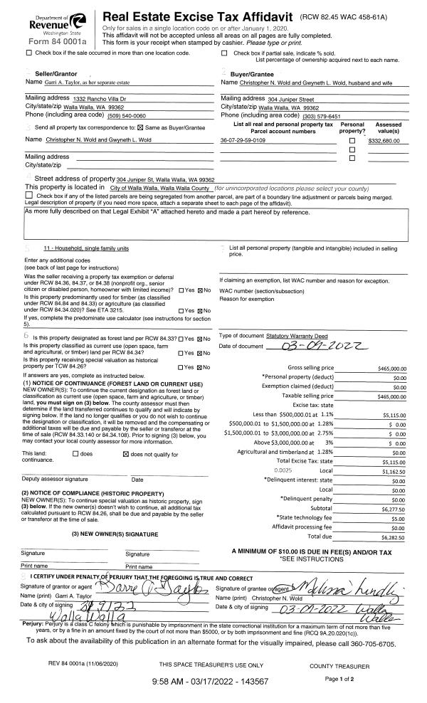| 2 | 03/17/2022 | SWD | STATUTORY WARRANTY DEED | TAYLOR GARRI ANN | WOLD CHRISTOPHER N & GWYNETH L | | | $465,000.00 | 143567 | 2022-02239 |