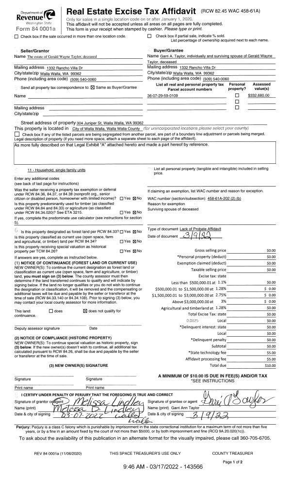 | 3 | 03/17/2022 | LOPA | LACK OF PROBATE AFFIDAVIT | TAYLOR GERALD W & GARRI A | TAYLOR GARRI ANN | | | $0.00 | 143566 | 2022-02238 |