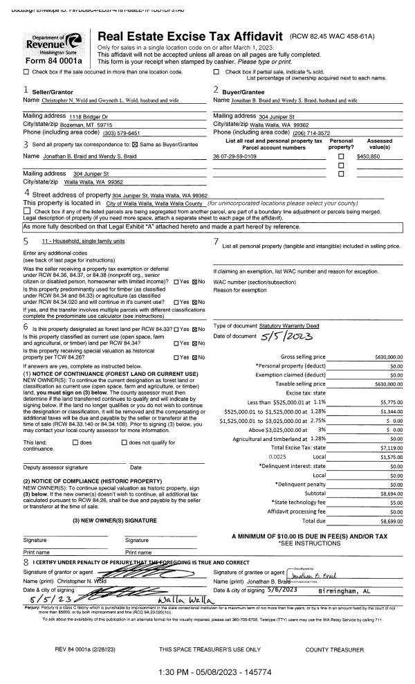 | 1 | 05/08/2023 | SWD | STATUTORY WARRANTY DEED | WOLD CHRISTOPHER N & GWYNETH L | BRAID JONATHAN B & WENDY S | | | $630,000.00 | 145774 | 2023-02417 |