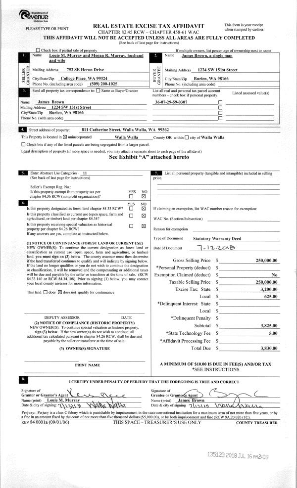 | 3 | 07/16/2018 | SWD | STATUTORY WARRANTY DEED | MURRAY LOUIE M & MEGAN R | BROWN JAMES G | | | $250,000.00 | 135123 | 2018-05755 |