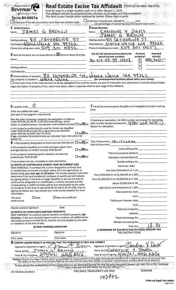 | Mailing Address: | CHRISTINE Y DAVIS 811 CATHERINE ST WALLA WALLA, WA 99362 | % Ownership: | 100.0000000000% |