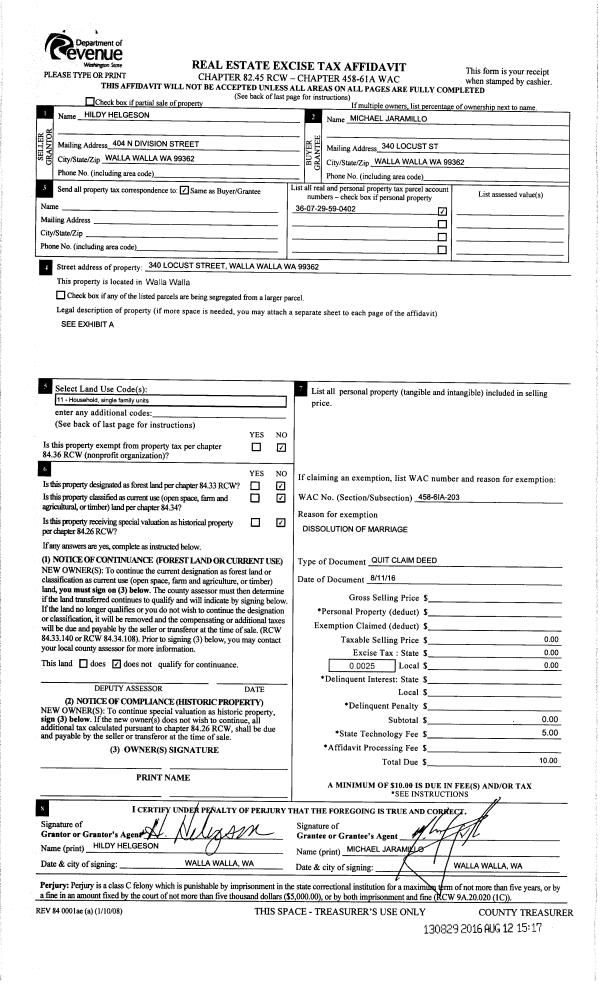 | 2 | 08/11/2016 | QCD | QUIT CLAIM DEED | JARAMILLO MICHAEL | JARAMILLO MICHAEL | | | $0.00 | 130829 | 2016-06443 |