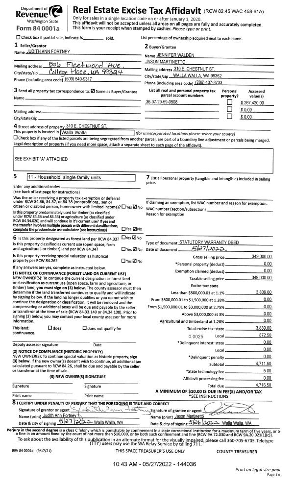 | 1 | 05/27/2022 | SWD | STATUTORY WARRANTY DEED | FORTNEY JUDITH ANN | WALDEN JENNIFER & JASON MARTINETTO | | | $349,000.00 | 144036 | 2022-04593 |