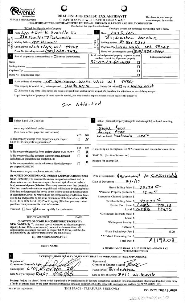 | 2 | 03/28/2017 | REAL ESTAT | REAL ESTATE CONTRACT | VIOLETTE LEO O & JUDITH J | M3D LLC | | | $77,979.00 | 132106 | 2017-02317 |