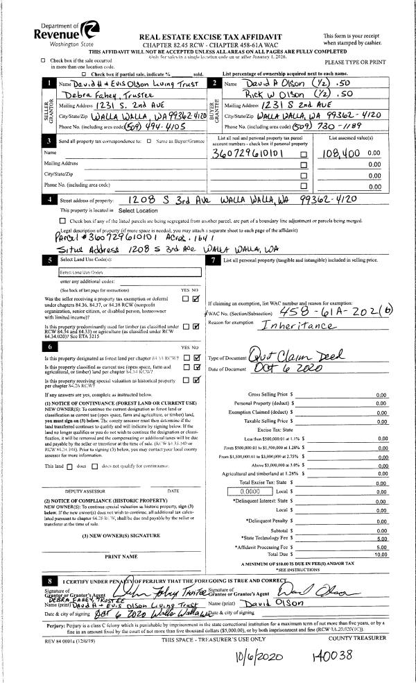 | 1 | 10/06/2020 | QCD | QUIT CLAIM DEED | OLSON DAVID & EVIS TST | OLSON DAVID A AND RICK W OLSON | | | | 140038 | 2020-10308 |