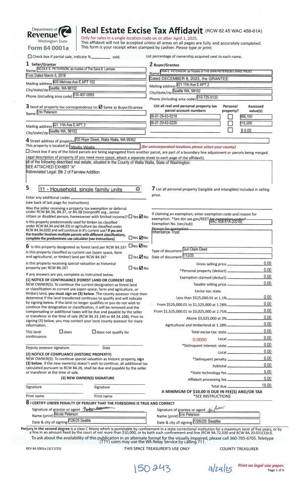 | 1 | 10/24/2025 | QCD | QUIT CLAIM DEED | LANHAM SARA B TRUST | PETERSON ERIN LIVING TRUST | | | | 150243 | 2025-06589 |